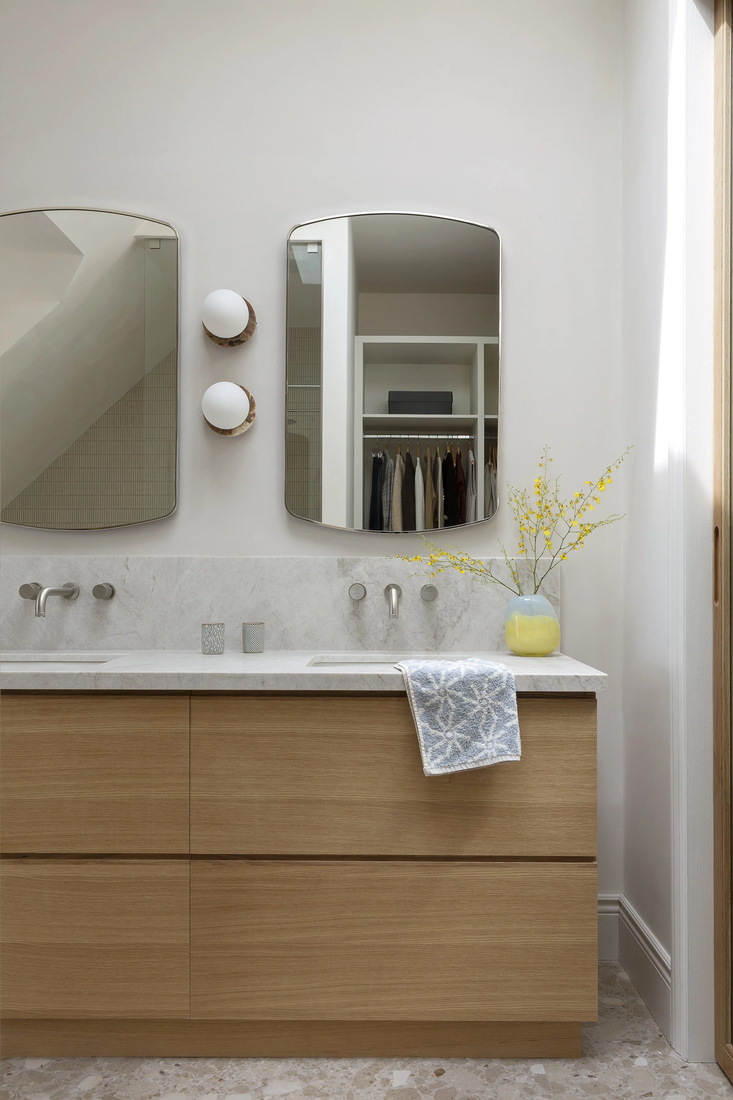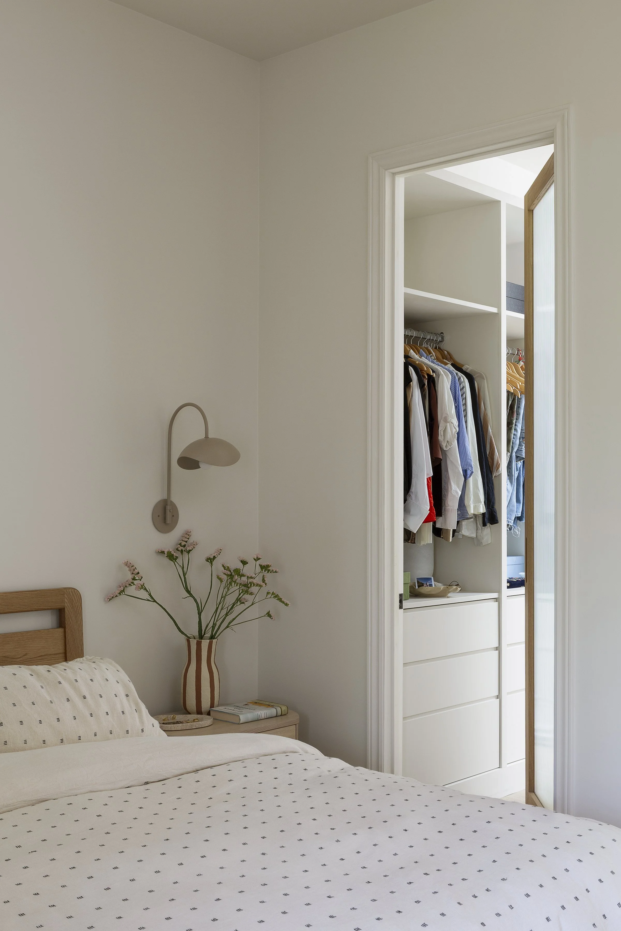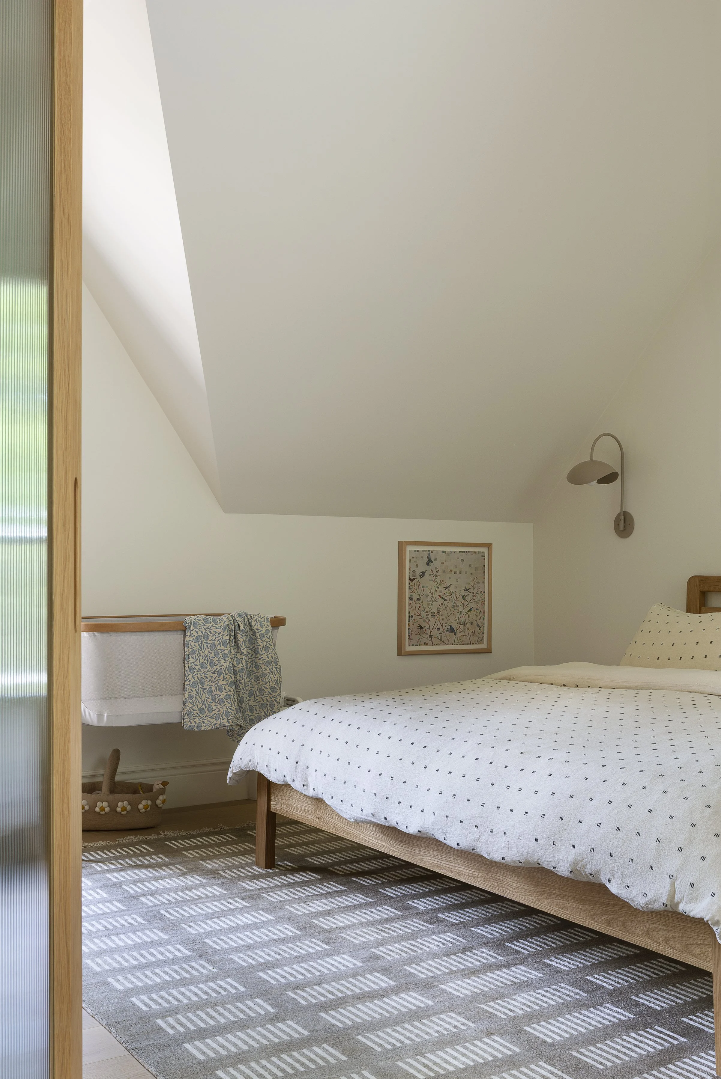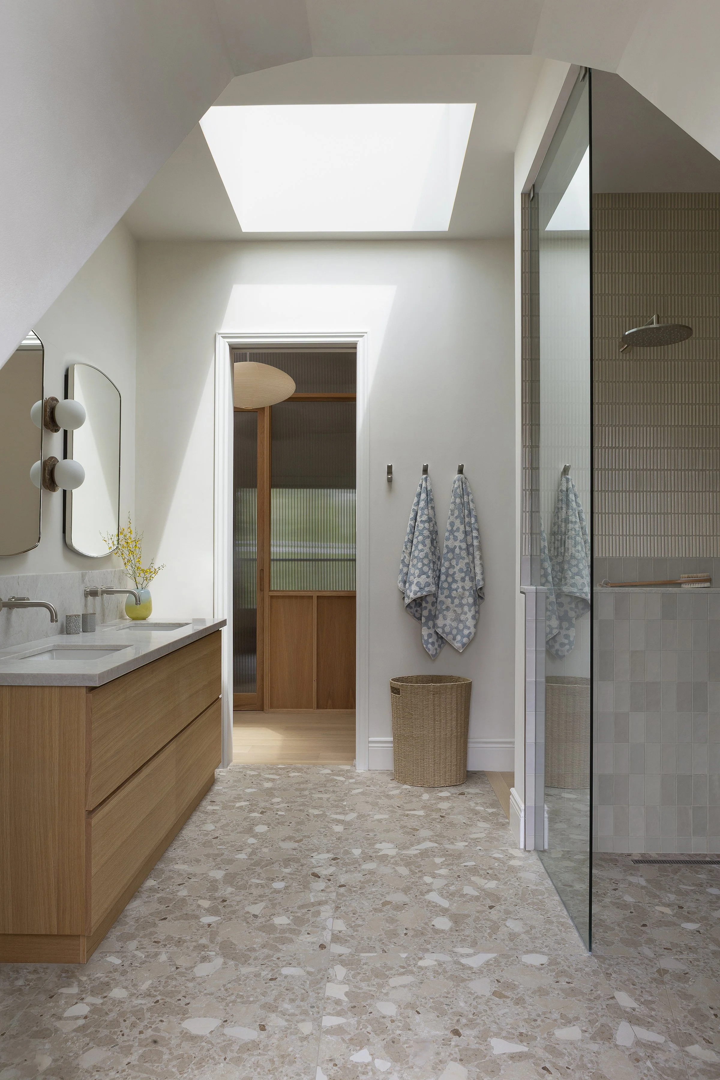 This Victorian home renovation transformed an existing third-floor apartment into a serene primary bedroom and ensuite retreat, seamlessly connected to the clients’ second-floor living space. By reimagining the stair and layout, uncovering unexpected ceiling height, and introducing natural light through a skylight and custom oak details, the design embraces warmth, openness, and calm. Grounded materials and soft finishes create a spa-like escape thoughtfully designed for a new chapter of family life.