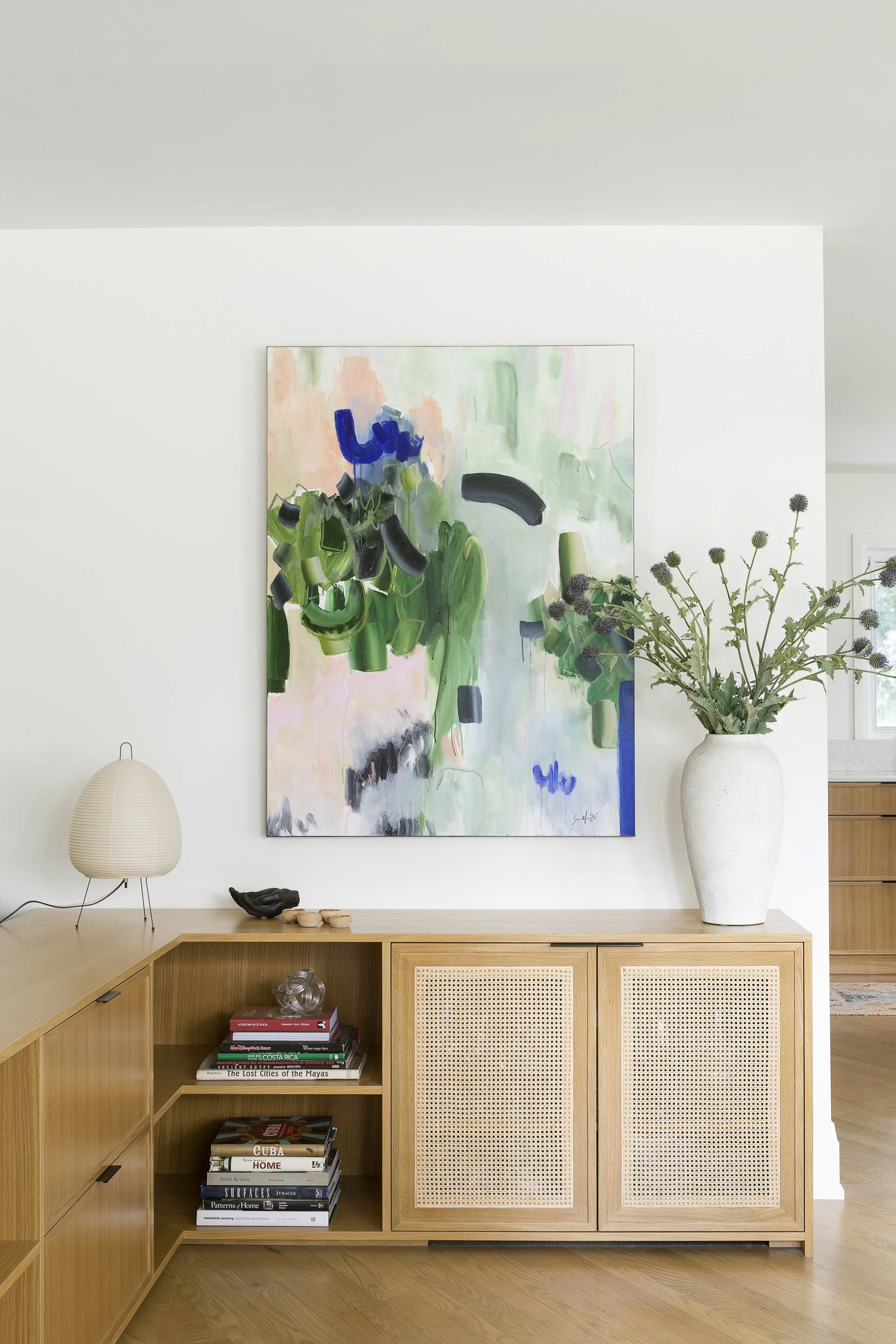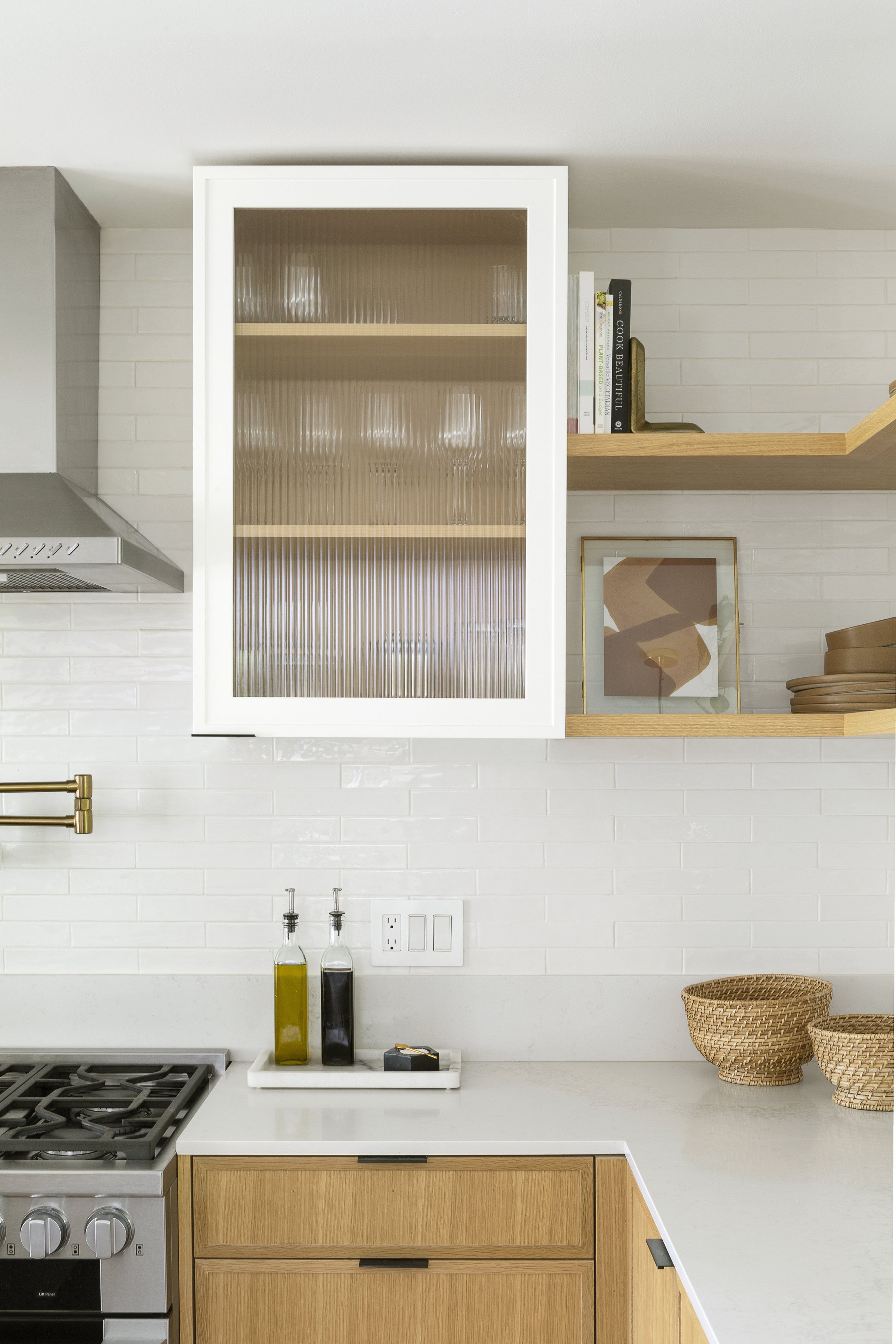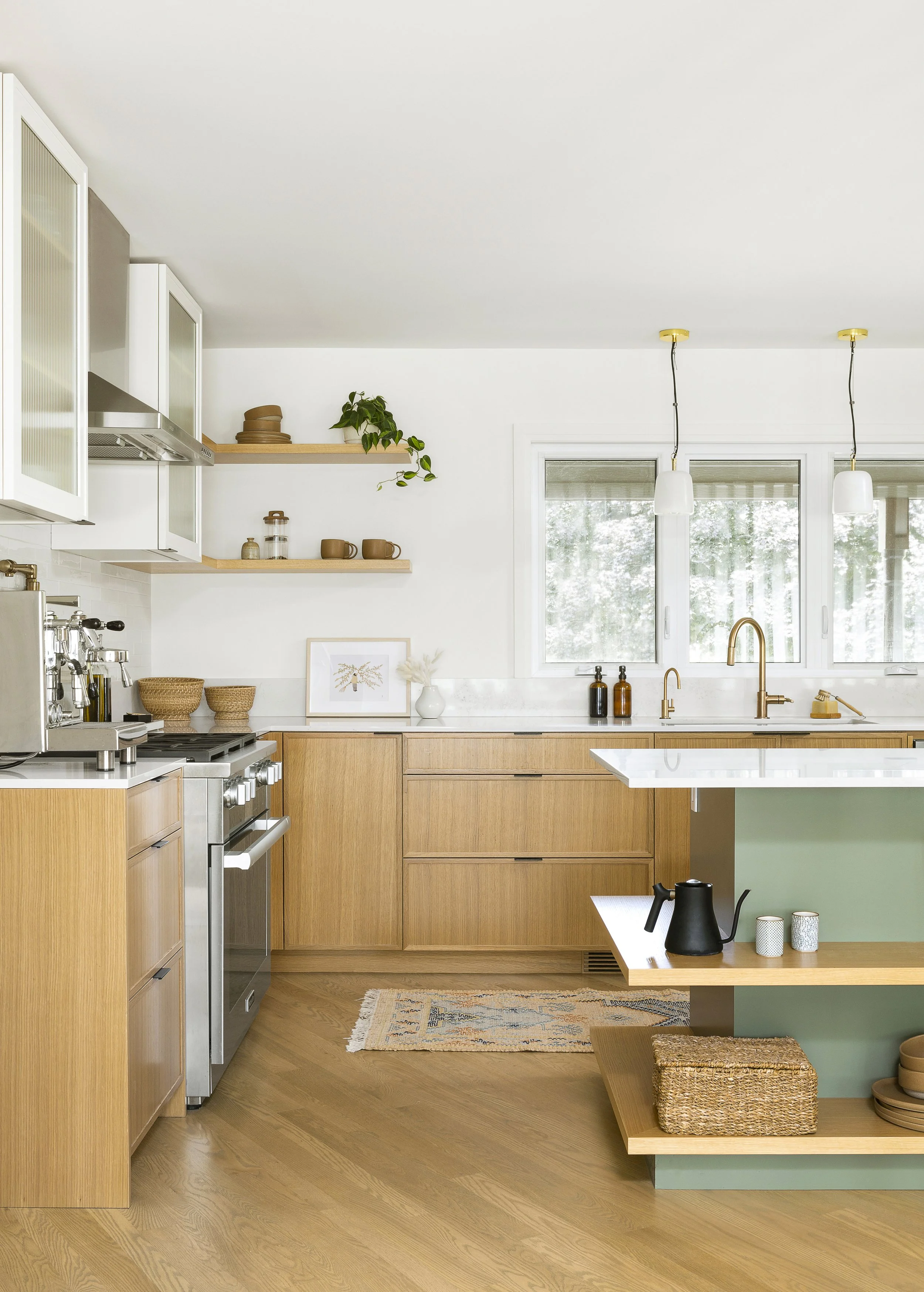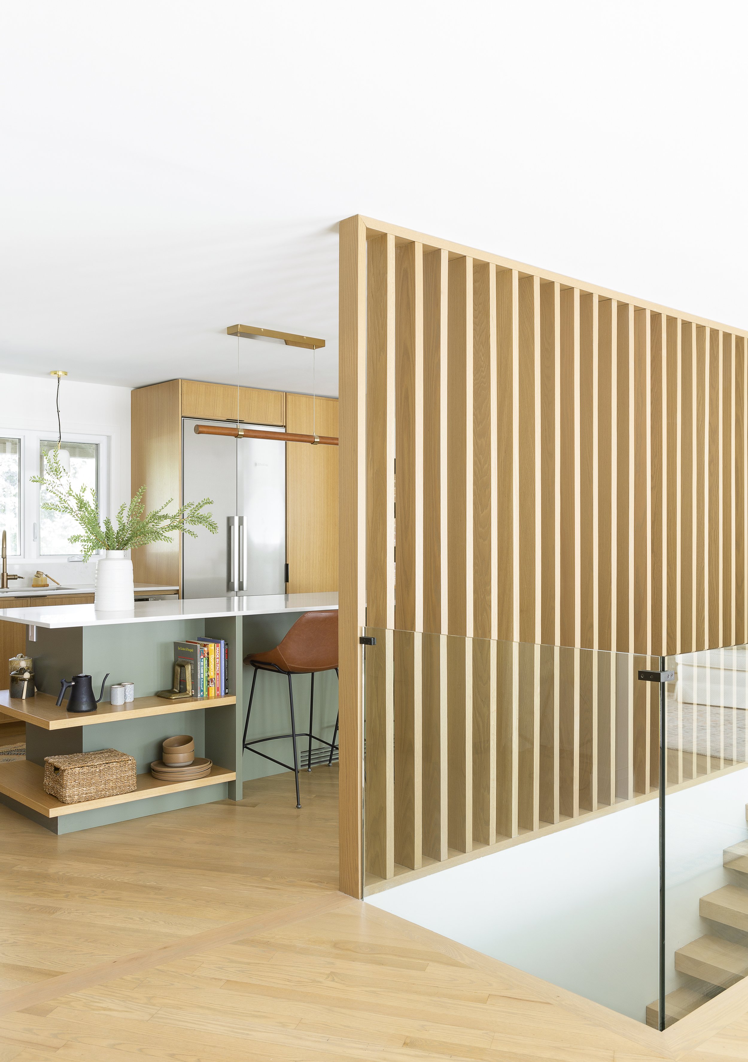 A complete kitchen gut, and opening up of the main floor space. We used low built in millwork and slats to divide the large open space into zones, without obstructing sight lines. .